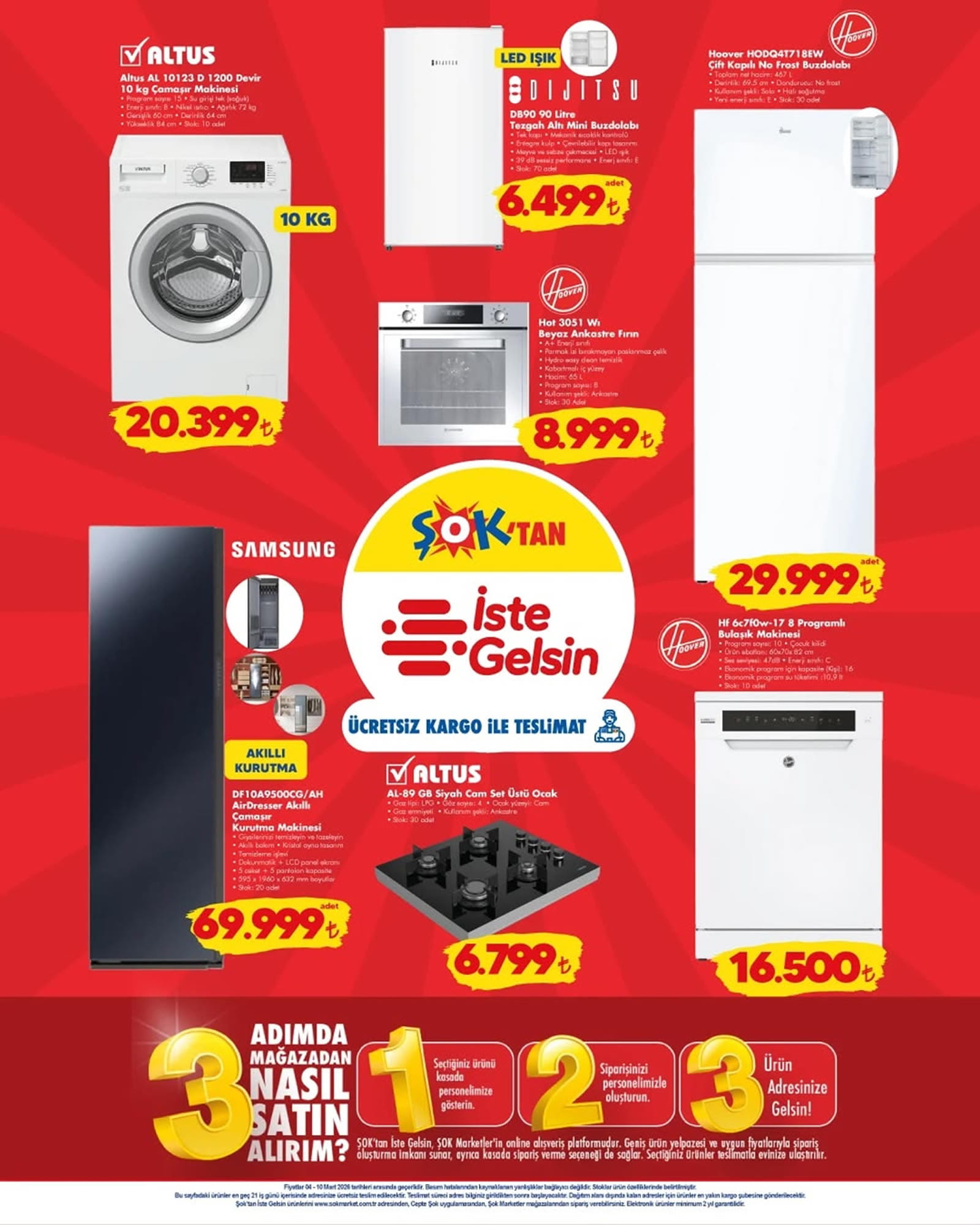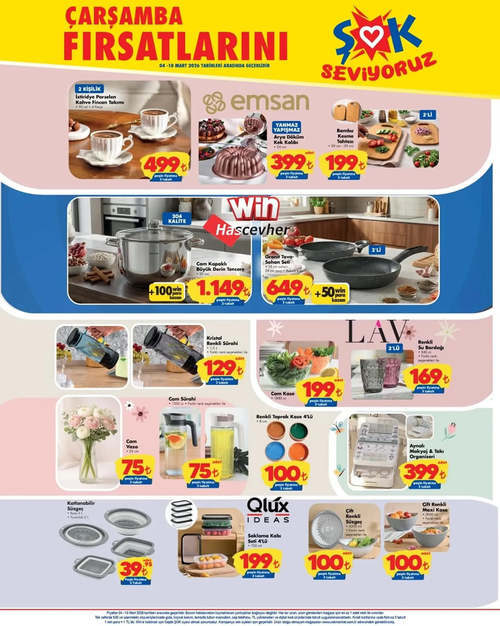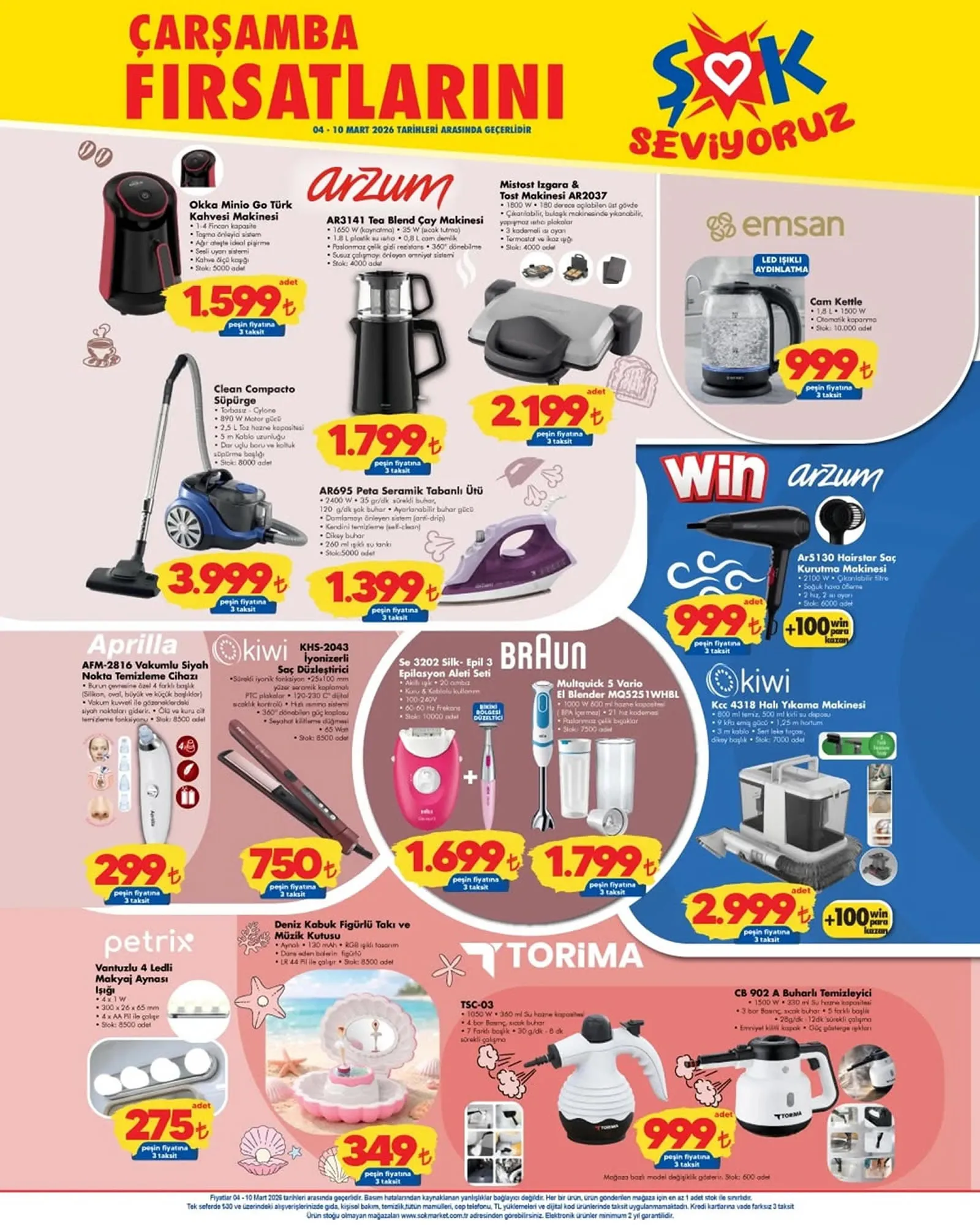 Türk kahvesi makinesi, çay makinesi, tost makinesi, süpürge, seramik tabanlı ütü, saç kurutma makinesi, epilasyon aleti, buharlı temizleyici, kahve fincan takımı, kek kalıbı, cam kapaklı büyük derin tencere, renkli sürahi, su bardağı, cam kase, toprak kase ve cam sürahi gibi ürünlerin yer aldığı 4 Mart tarihinden itibaren geçerli olan ŞOK kataloğu yayınlandı.